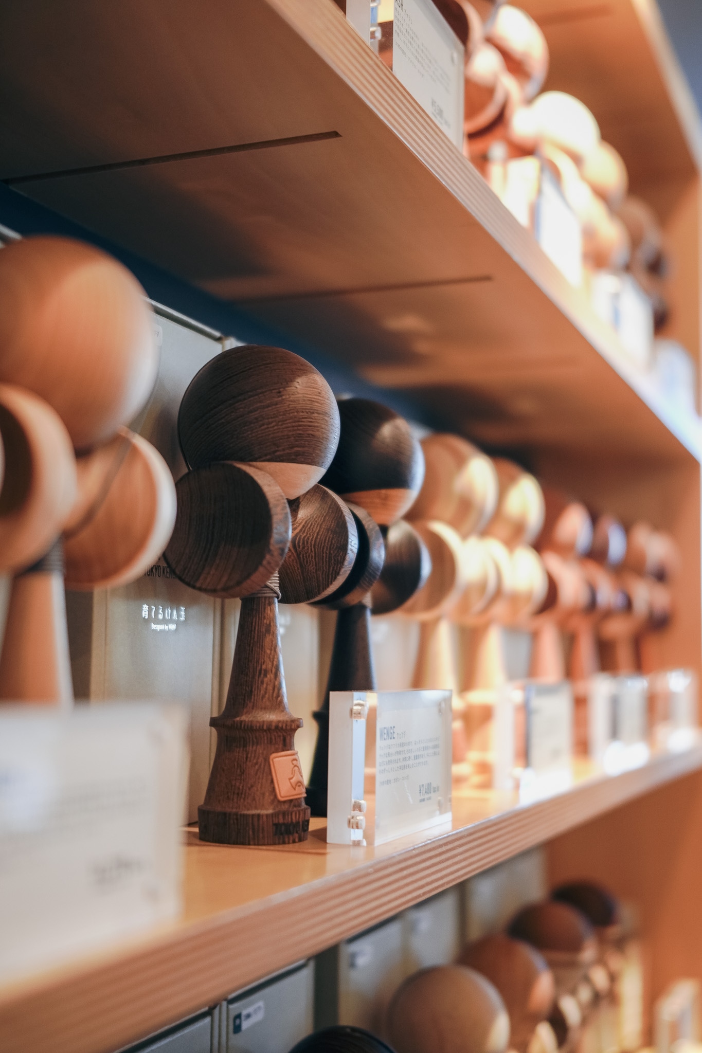 13種類のけん玉は、すべて新品と使用後のサンプルを並べており、実際に手に取って、木材ごとの質感や重さの違いを体感していただけます。直営店を持たず、インターネットでの販売を中心としているTOKYO KENDAMAにとって、実際に触れて選んでいただける機会は決して多くありません。